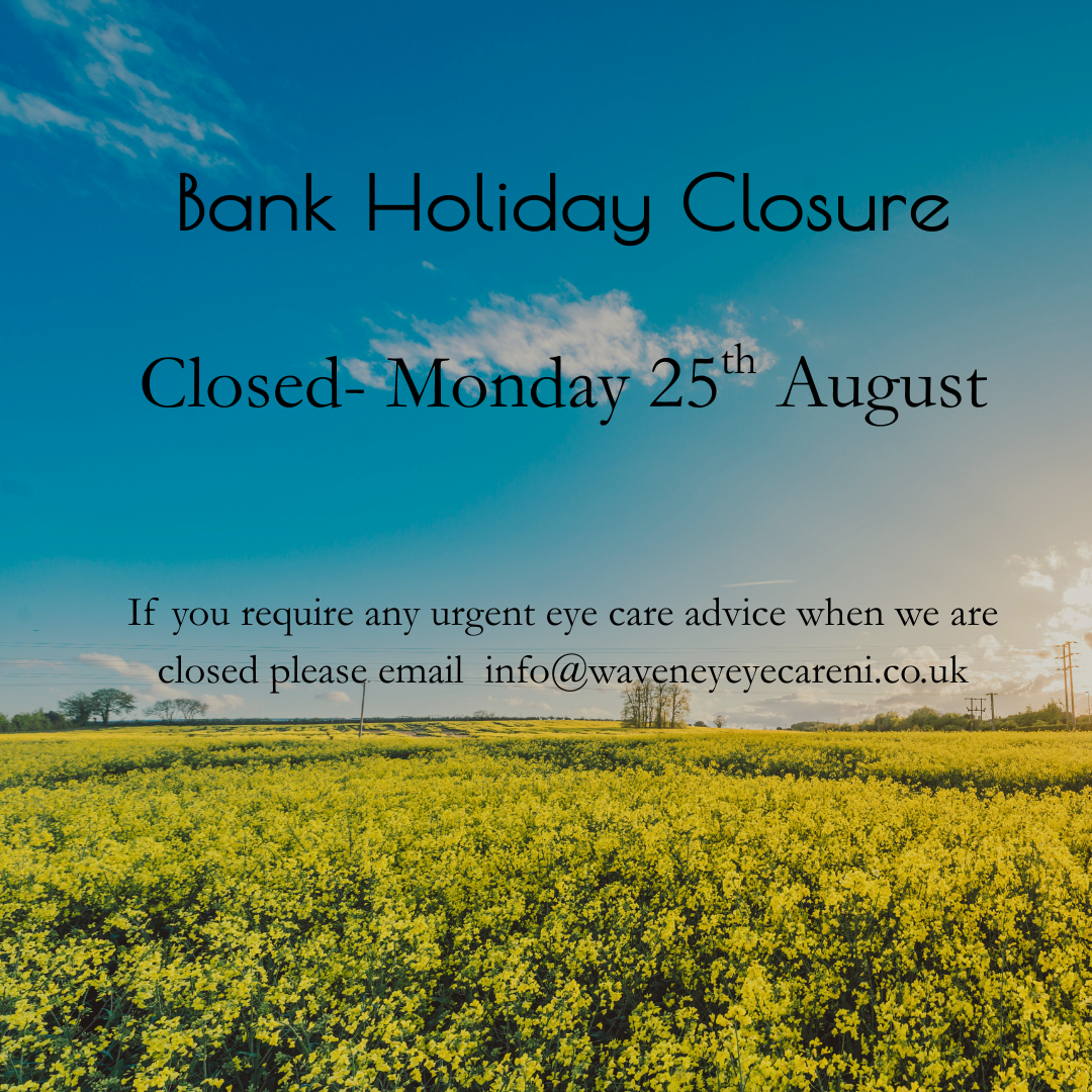 May Bank Holiday Closures Closed- Monday 5th May Closed Monday 26th May If you require any urgent eye care advice when we are closed please email info@waveneyeyecareni.co.uk (1)